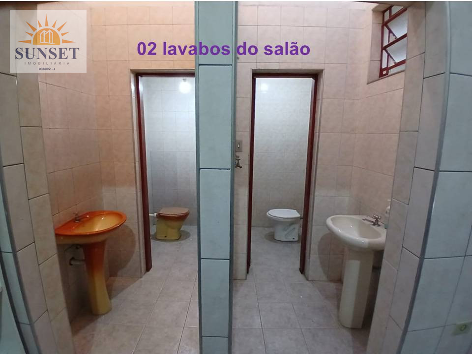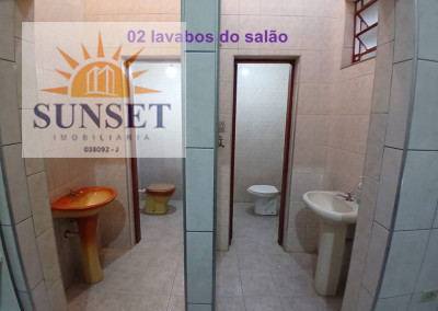 Salão com 90m², com revestimento até o meio da parede, e 2 lavabos